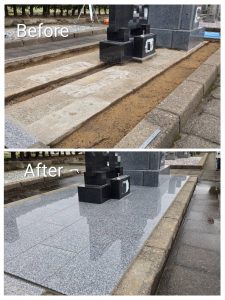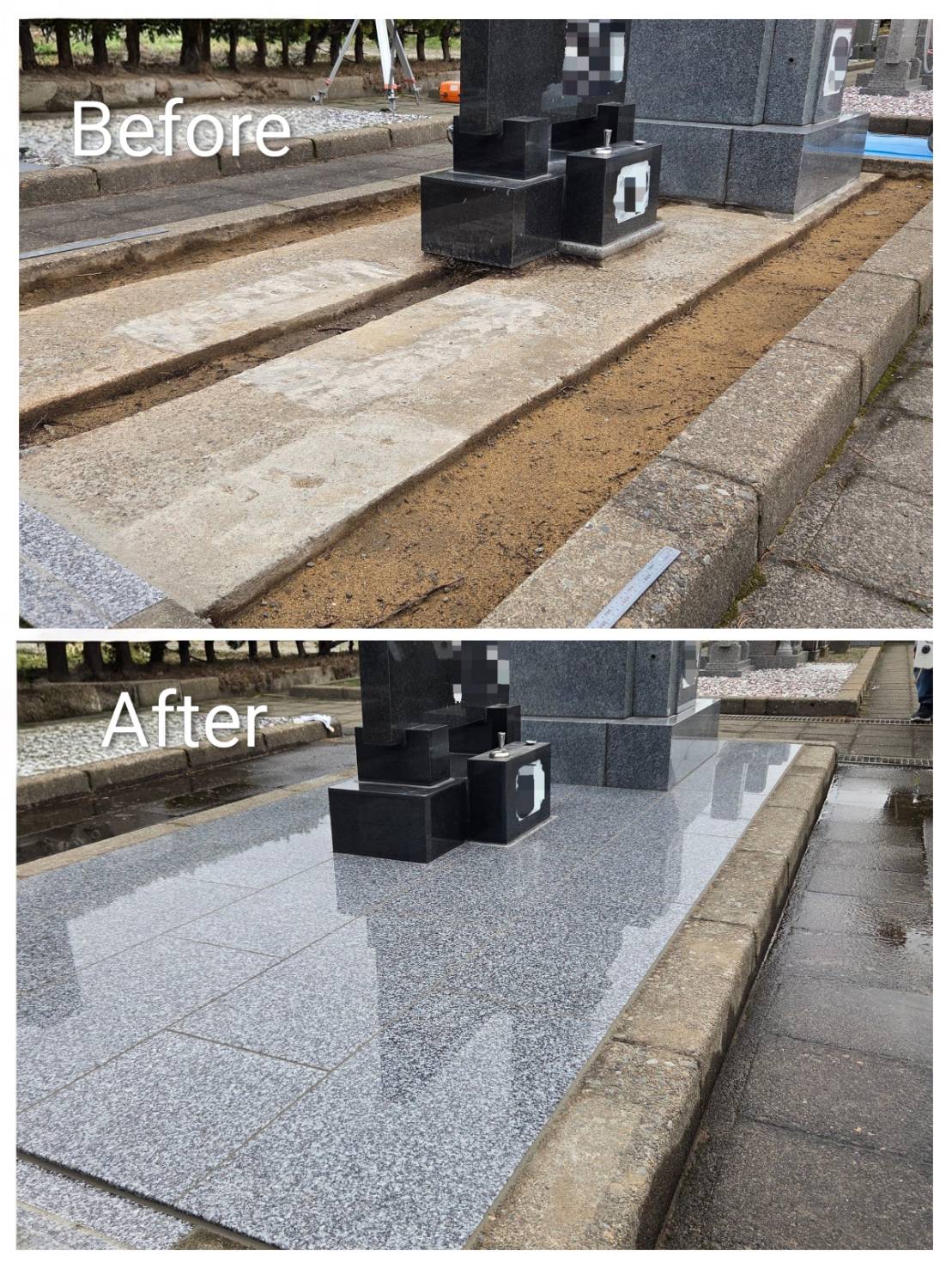 【施工後(After)】 石を貼り、雨の日でも汚れにくく、お参りのしやすい美しい空間に生まれ変わりました! この光沢感、いかがでしょうか?